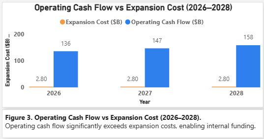The cash flow model of Amazon shows that under the existing conditions the capital development can be financed internally. According to historical cleaned data, it indicates operating cash flow is growing by increasing by 46.3 billion in 2021 to 124.5 billion in 2025. The projected case then increases operating cash flow to $135.7 billion in 2026, $146.6 billion in 2027, and $158.3 billion in 2028. Oppositely, the model uses a 2.8-billion-yearly growth requirement. This base can be justified by the recent annual reporting on the operating cash flow and capital investment capacity of Amazon (Amazon.com, Inc., 2025).