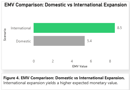 The weighted score also indicates a strong inclination towards international expansion, as 6.99 and 2.81 give the same score in favor of international expansion and domestic expansion, respectively. Although the risk score of international expansion is higher than that of domestic expansion (4 and 2 respectively), the diversification score of international expansion is also high (5 vs. 2). The same outcome is supported by EMV model. The EMV of domestic expansion is 5.355 billion and that of international expansion is 8.515. International expansion is also preferred in the decision table using the maximax, maximin, and EMV rules. This finding is also in line with the corporate reporting format and a global operating profile of Amazon that is investor-facing (Amazon.com, Inc., 2025; Amazon.com, n.d.).