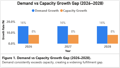 Amazon’s growth analysis indicates a significant imbalance between projected demand and existing capacity. The model projects a 16.0% annual demand growth compared to an 8.0% capacity growth rate, resulting in a widening fulfillment gap over time.