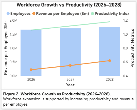 The personnel model of Amazon is directly connected with the projected expansion case. The Excel workbook is based on 16.0 percent demand growth, but it also thinks that with automation and improved labor leveling a 6.0 percent productivity improvement can be achieved. It implies that the workforce growth required is modelled at 10.0 percent as opposed to the entire growth of demand. The staffing model forecasts the workforce of 1,666,080 in 2026, 1,716,062 in 2027, and 1,767,544 in 2028, with the historical workforce based on the size and structure of workforce reported by Amazon (Amazon.com, Inc., 2025).